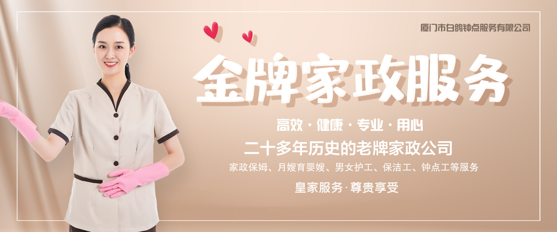 廈門市白鴿家政服務(wù)有(yǒu)限公(gōng)司,是經過廈門市正規注冊企業,成立于1998年年10月,二十多(duō)年曆史的老牌家政公(gōng)司。下設家政技(jì )能(néng)培訓部、保潔鍾點工(gōng)服務(wù)部、保姆月嫂育嬰嫂,男女護工(gōng)之類服務(wù)。